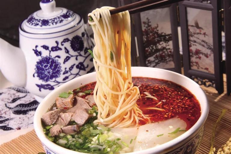 一碗熱氣騰騰的牛肉面,搭配鹵蛋和一盤牛肉,熱量雙倍的碳水誰能不愛。蘭州牛肉面,起源于清代嘉慶年間,后經(jīng)傳承發(fā)展,以“一清(湯)二白(蘿卜)三紅(辣子)四綠(香菜蒜苗)五黃(面條黃亮)”等形式,統(tǒng)一了蘭州牛肉面的標(biāo)準(zhǔn)。一塊小小的面團(tuán),在蘭州牛肉面師傅手里可以現(xiàn)拉出九種面型,從細(xì)到粗、從窄到寬分別為毛細(xì)、細(xì)、二細(xì)、三細(xì)、二柱子、蕎麥棱、韭葉、薄寬、大寬。過去還有一種面型叫“工字面”,橫截面是火車鐵軌形狀,已經(jīng)基本失傳了。推薦蘭州人吃牛肉面的經(jīng)典吃法“肉蛋雙飛”(“肉蛋雙飛”就是在原有的牛肉面上加一顆鹵蛋和一份牛肉)。