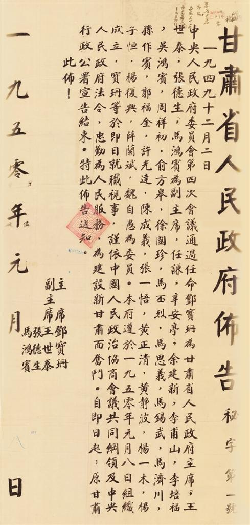 1950年1月,甘肅省人民政府頒發(fā)的第一號布告。
