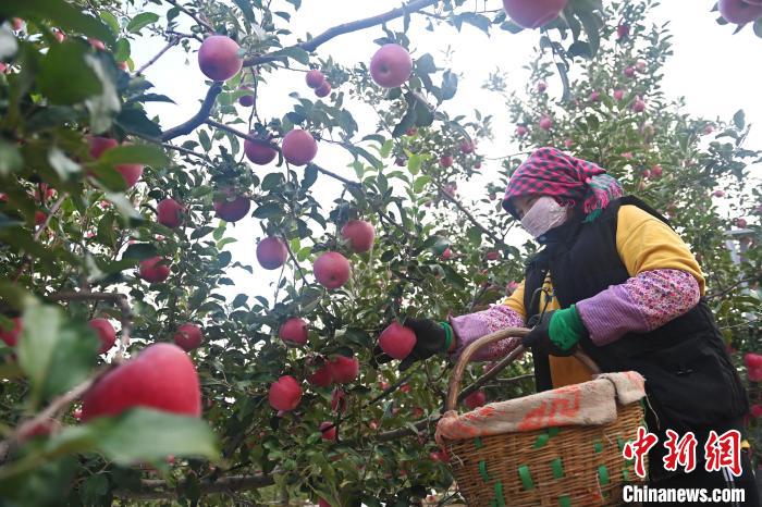 10月21日,在甘肅省天水市秦安縣一果園內(nèi),果農(nóng)進(jìn)行蘋果采收工作。李亞龍 攝