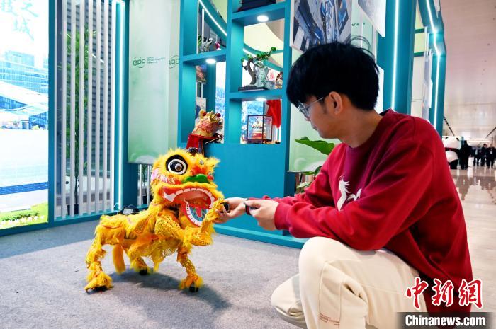 11月26日,四川成都,與會嘉賓和機器人獅子互動。中新社記者 安源 攝