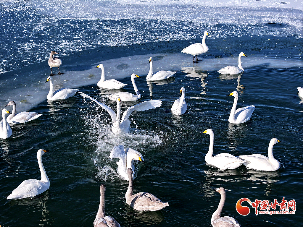 近日,在甘肅省張掖國家濕地公園,成群的越冬天鵝在冰封的湖面上悠然覓食、嬉戲,構(gòu)成了一幅動人的生態(tài)畫卷,成為冬日里一道尤為引人注目的風(fēng)景線。