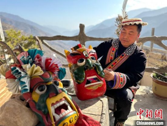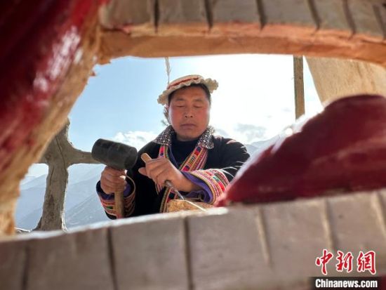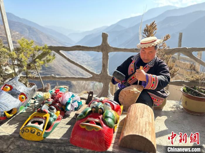 雕刻、打磨、上色……甘肅隴南市文縣鐵樓藏族鄉(xiāng)強(qiáng)曲村,白馬人薛剛一家四代人都精于木工。日前中新網(wǎng)記者走訪村子時(shí),薛剛坐在自家院子里,伏案制作池哥晝所用面具。池哥晝是白馬人保留最完整、最具特色民族舞蹈,面具是重要道具之一。薛剛制作的面具不僅用于周邊村子的池哥晝中,而且被廣州、上海等地的客商購買收藏。他時(shí)常將自己的想象融入面具中,用心打磨使其更具“靈氣”。他說,白馬人中從事面具雕刻的手藝人不多,最近他物色了一個(gè)“00后”徒弟,對方興趣濃厚,希望將這門手藝保護(hù)傳承好。圖為薛剛在院子里雕刻面具。閆姣 攝
