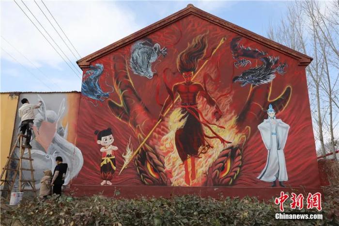2025年2月12日,山東淄博周村區(qū)沈家村,一幅高10米、寬8米的哪吒墻繪走紅。該墻繪由當(dāng)?shù)?ldquo;90后”墻繪師沈靖宇手繪完成。中新社記者 王采怡 攝