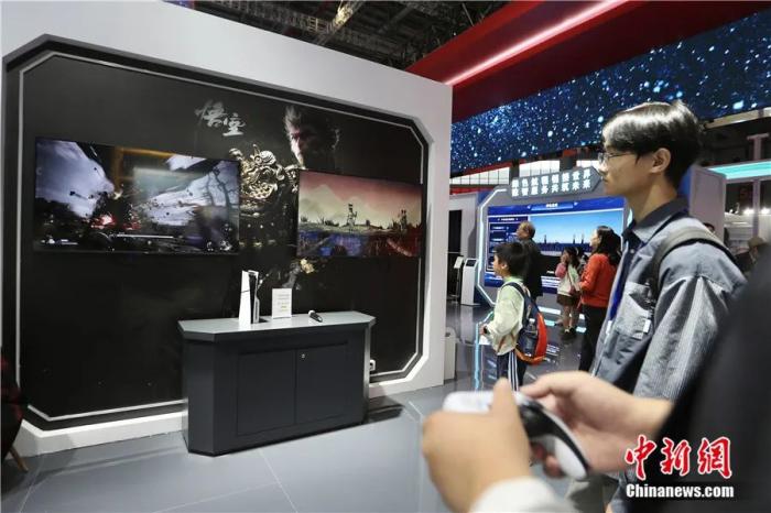 2024年11月5日至10日,第七屆中國(guó)國(guó)際進(jìn)口博覽會(huì)在上海舉辦。圖為11月9日觀眾在中國(guó)館體驗(yàn)游戲《黑神話:悟空》。中新社記者 王紫儒 攝