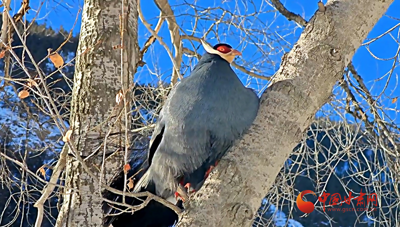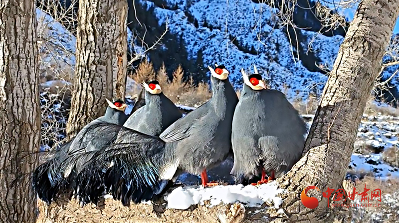 巡護(hù)員用鏡頭記錄下畫面,二十余只藍(lán)馬雞宛如冰雪精靈,在銀裝素裹的喬木林間愜意“聚會(huì)”。三五成群的藍(lán)馬雞用強(qiáng)健有力的爪喙翻動(dòng)雪層,精準(zhǔn)定位埋藏的草籽,專心干飯。距地面十余米的楊樹(shù)上,擔(dān)任警戒的“哨兵”不時(shí)發(fā)出低沉的咕嚕聲,蓬松的尾羽在陽(yáng)光下流轉(zhuǎn)著金屬般的光澤。最引人注目的當(dāng)數(shù)林間空地上的“時(shí)裝秀”了,“模特”們輪流抖動(dòng)藍(lán)黑漸變的羽毛,頸后白色耳羽簇如流蘇輕顫,精彩的表演折服了五位“評(píng)委”,它們個(gè)個(gè)目不轉(zhuǎn)睛,生怕漏掉每一個(gè)演出細(xì)節(jié)。這場(chǎng)持續(xù)數(shù)小時(shí)的藍(lán)馬雞“聚會(huì)”也為祁連山國(guó)家公園生態(tài)系統(tǒng)健康運(yùn)轉(zhuǎn)做出了生動(dòng)注腳。