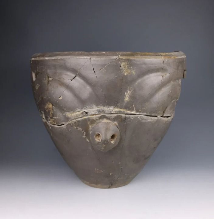 然而,馬家窯人的藝術創(chuàng)造力似乎遠不止于此。寺洼遺址新出土的眾多陶器展現(xiàn)出全新的造型與紋飾風格。如其中一件帶有“豬鼻”的馬家窯類型泥質灰陶,色澤深沉灰黑如夜,一只鼻子自陶胎中緩緩隆起,上方的弧形紋理像舒展的眉骨,又像張開的羽翼,一場古文明的夢境由此展開。