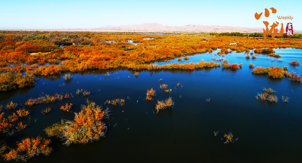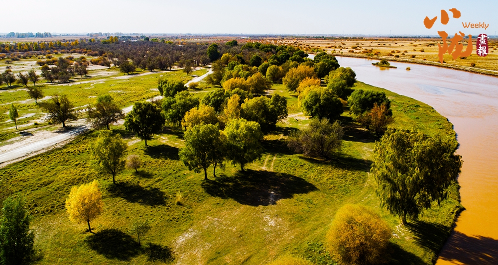金色胡楊在陽光下泛著溫暖光澤,斑斕絢麗的蘆葦如金色絲帶點綴荒漠,與碧綠河水、湛藍天空構(gòu)成濃墨重彩的秋日圖景。