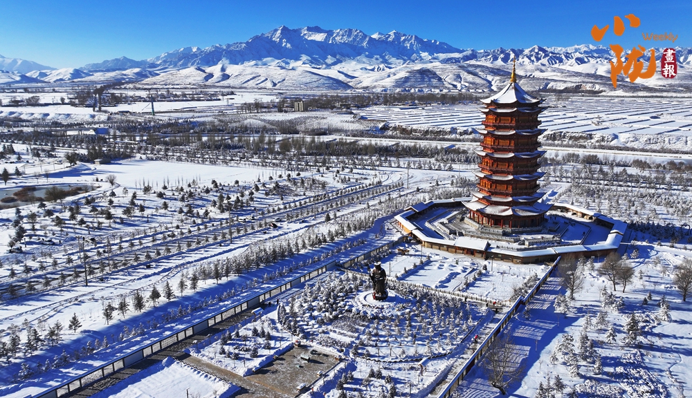 雪后初霽,銀白的民樂公園,在陽光下熠熠生輝,安靜且神秘,與遠(yuǎn)處綿延的祁連山構(gòu)成一幅璀璨的畫卷。